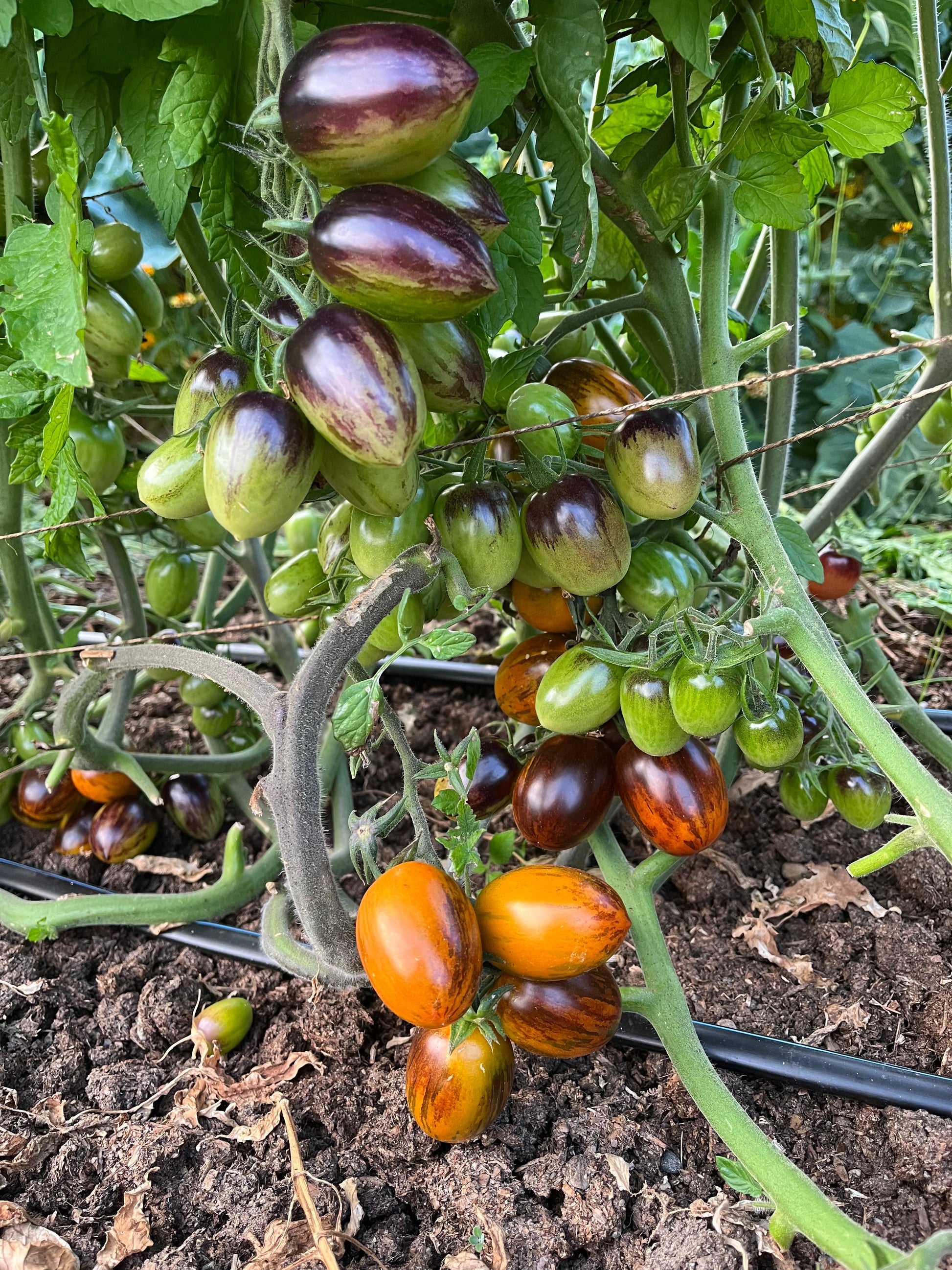 This is a colourful tomato breeding project in its third (F3) generation from the initial cross I made. I saved seeds from most plants in this generation, so expect a lot of diversity. They range from cocktail to grape and cherry sizes. The parents were two of my favourite varieties- a colourful grape tomato with lots of anthocyanin striping, and a small sweet red cherry tomato. Both parents have amazing flavour. There are sure to be some treasures in this mix!