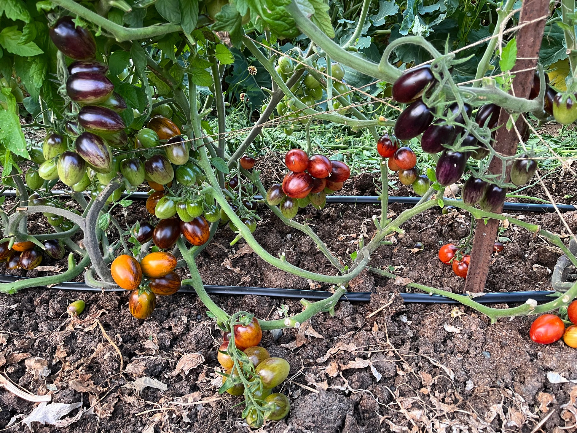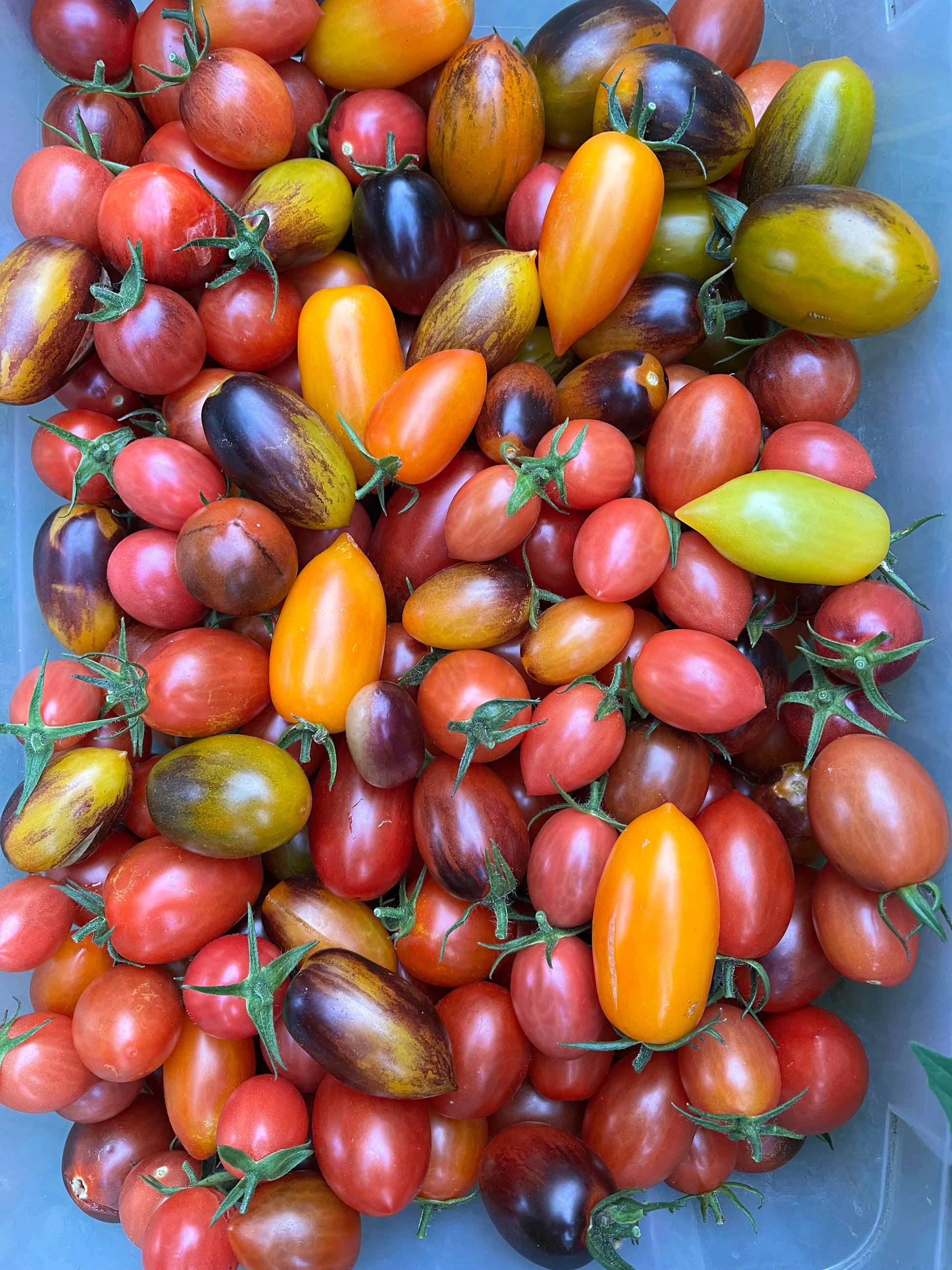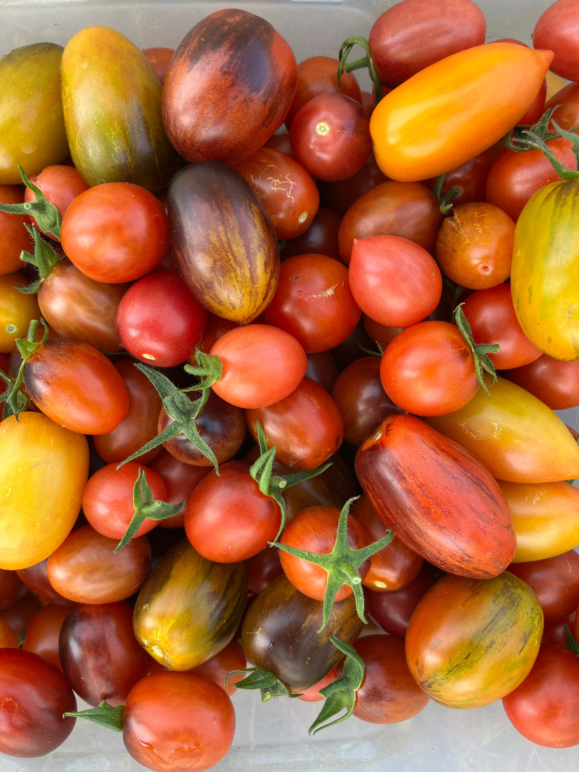 Start indoors 6-8 weeks before planting out date. In southwestern BC, I plant mid-March for planting out mid-May. Seeds benefit from bottom heat when germinating. Grow in full sun. Stake plants with a tomato cage, trellis, or wires. Plants can grow 6+ feet tall depending how you prune and train them. Because the varieties are different colours when ripe, it’s best to use the “squish test” instead of colour to tell when they are ripe- Fruits are ripe when they are slightly soft to the touch (when they “give” a little when gently squeezed with your fingers).