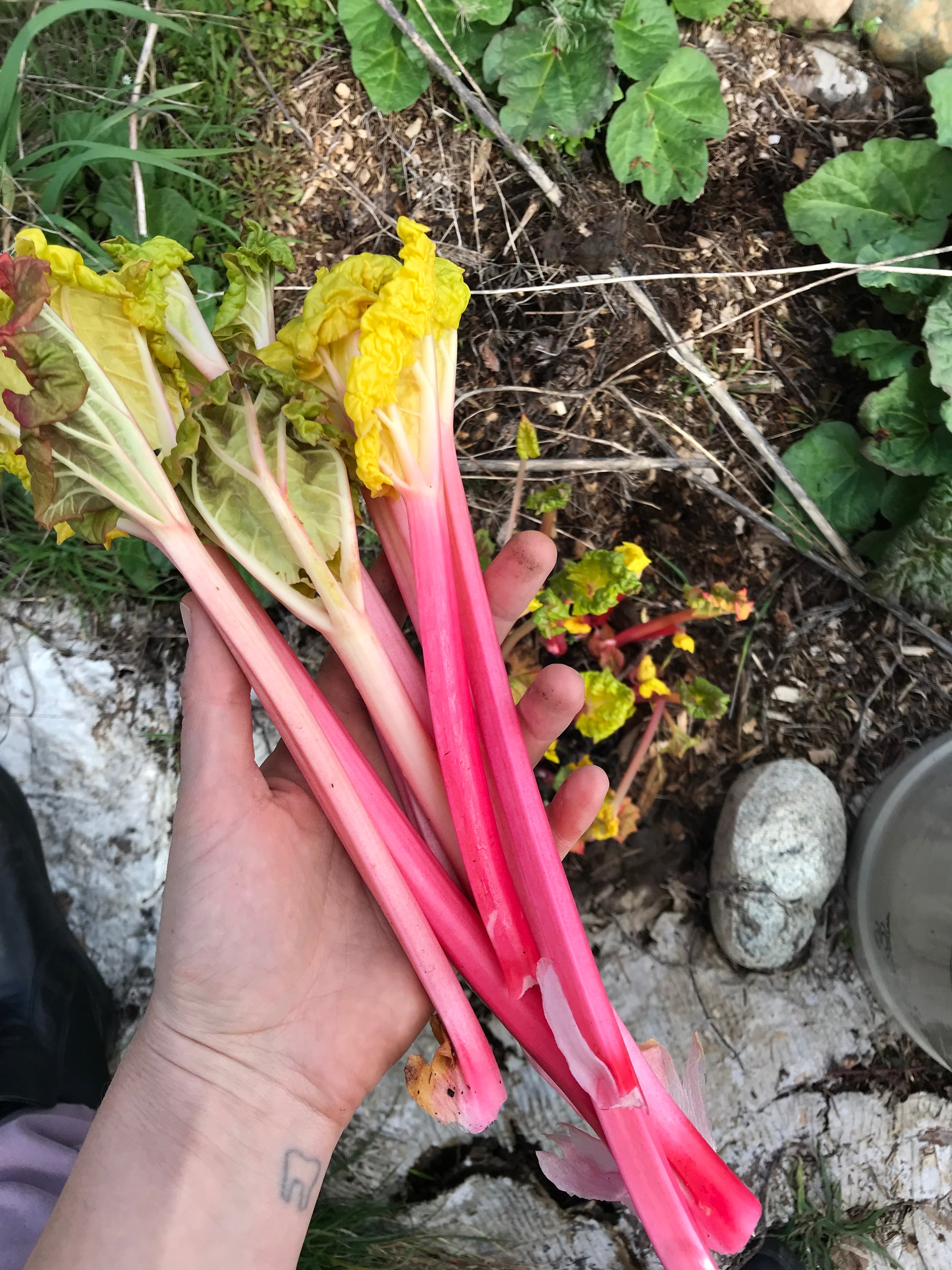 Once the plant is well-established, try blanching a portion of the emerging stems with a bucket or ceramic pot to exclude light and make the rhubarb tender and bright pink! See photos 1-3.